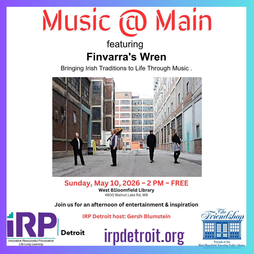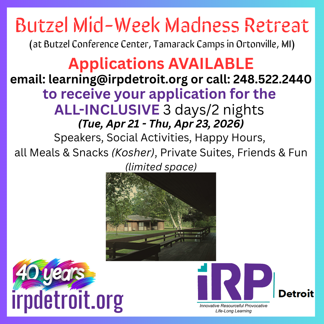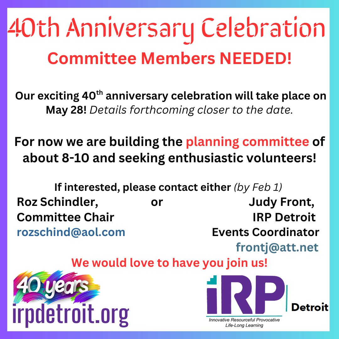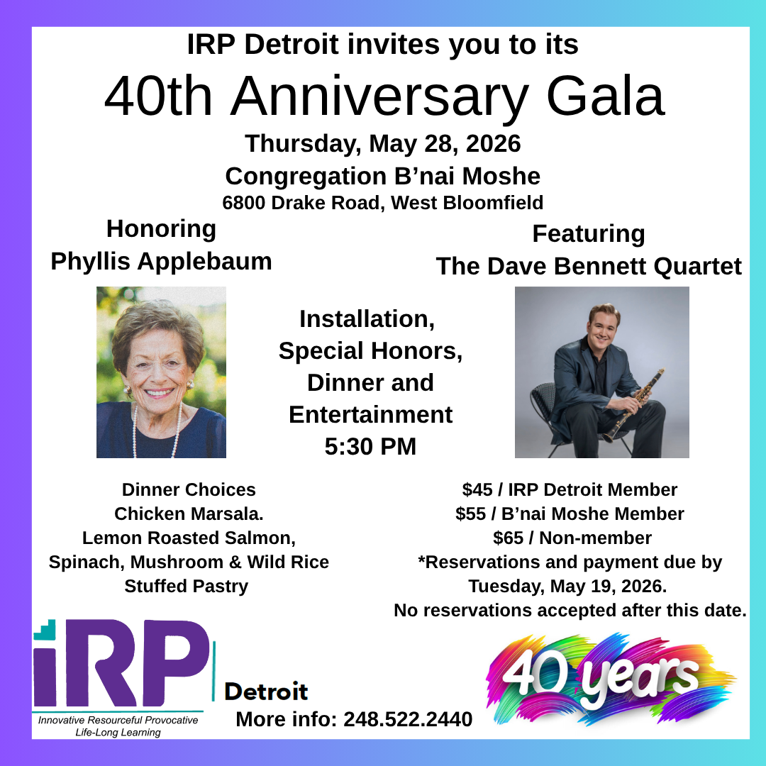 Welcome to IRP Detroit! We are a vibrant community of life-long learners creating a forum together for adults seeking both intellectual stimulation and social engagement. At IRP Detroit, we pride ourselves on fostering an inclusive environment where members creatively pursue interests together with a year-round calendar of activities, events and a dynamic array of topical and educational interest groups designed to ignite curiosity and encourage meaningful conversations.